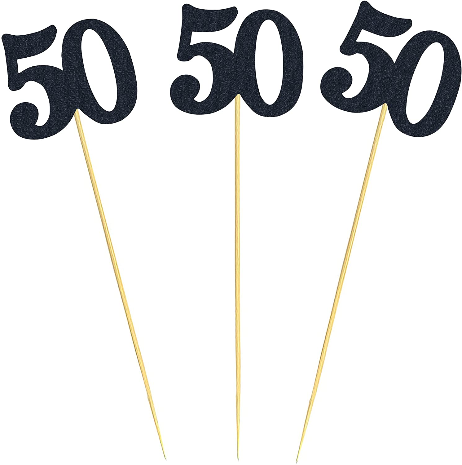 Features and purposes A pack of 12. These number 50 centerpiece sticks are perfect for anniversaries, birthdays, party supplies, centerpieces, and floral decorations. Made of glitter card stock and bamboo stick . Specification SIZE- The total length is about 10.2 inches. MATERIAL- card stock and bamboo stick COLOR- Black Glitter Package includes 12 in a pack.