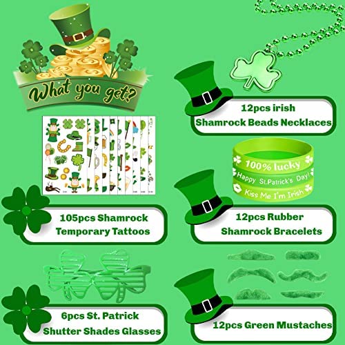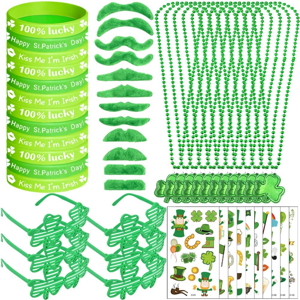 147 Pcs St. Patricks Day Party Favors Set, Green Shamrock Necklaces Eyeglasses, Bracelets Temporary Tattoos Mustaches for St Patricks Day Irish Accessories Party Supplies