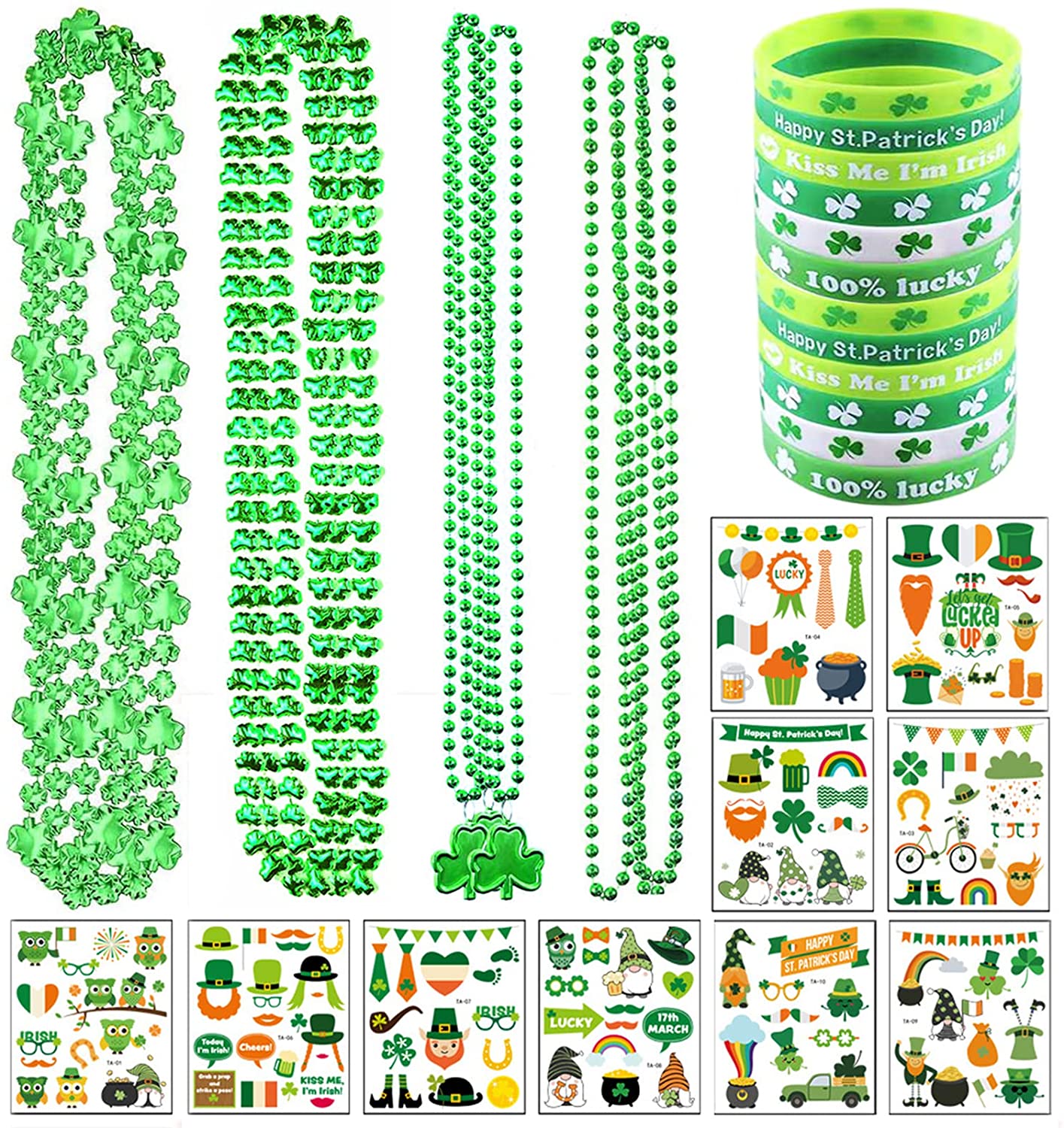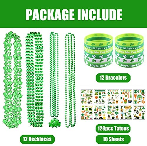152pcs St. Patricks Day Party Favor Set, Saint Patricks Day Dressing-up Accessories Include 12 Bracelets, 12 Beaded Necklaces and 128 Temporary Tattoos for Festivals Parades Irish Party Supplies Decorations