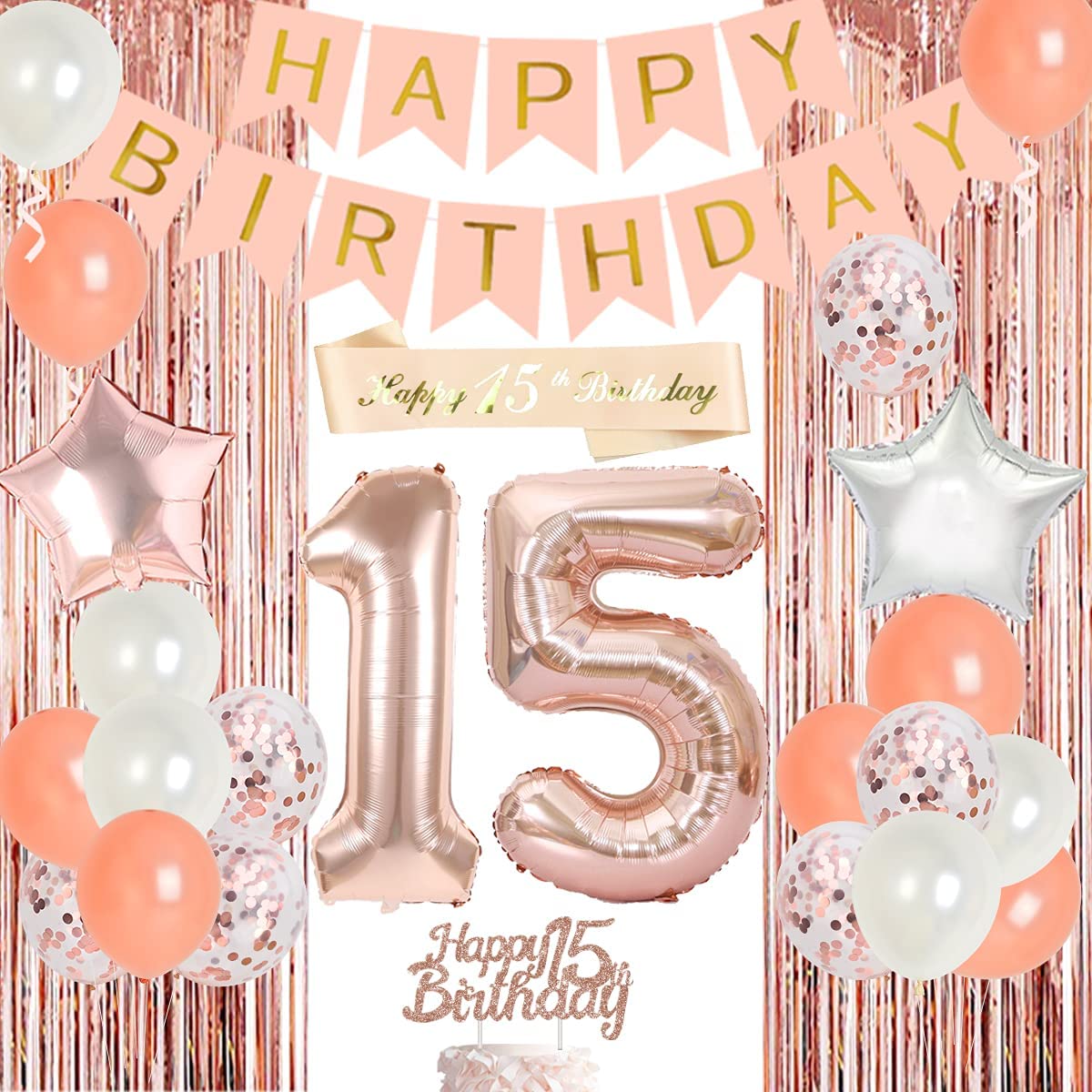 15th Birthday Decorations for Girls Rose Gold Sweet 15 Birthday Party Supplies with Happy Birthday Banner Cake Topper Sash Number 15 Star Foil Balloons Tinsel Curtain 15 Year Old Birthday Decor