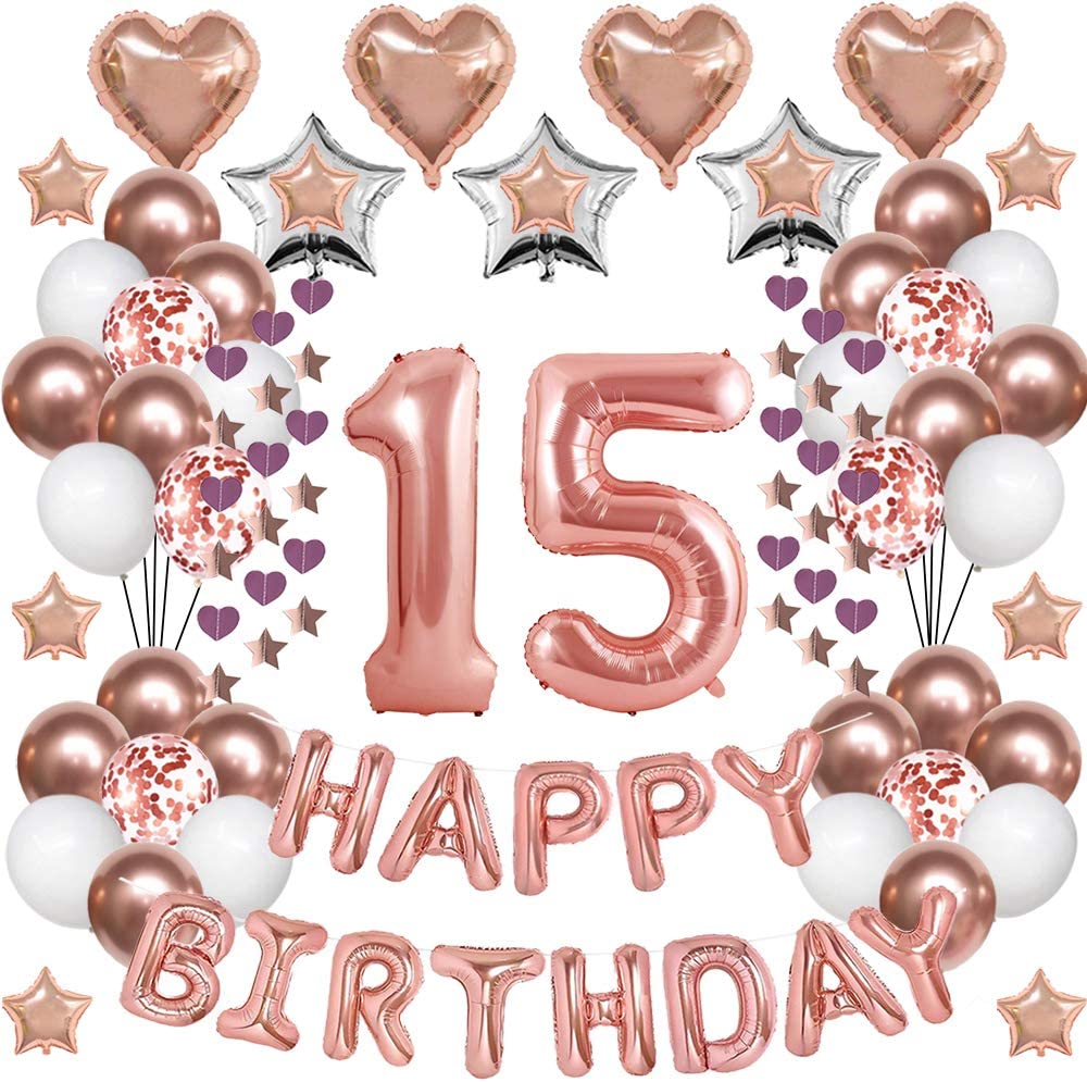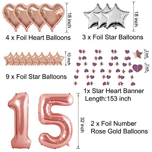 15th Rose Gold Birthday Decorations,15th Birthday Balloons Supplies for Girl Women Happy Birthday Banner Rose Gold 15 Number Balloon Star Heart Foil Balloons Confetti Balloons