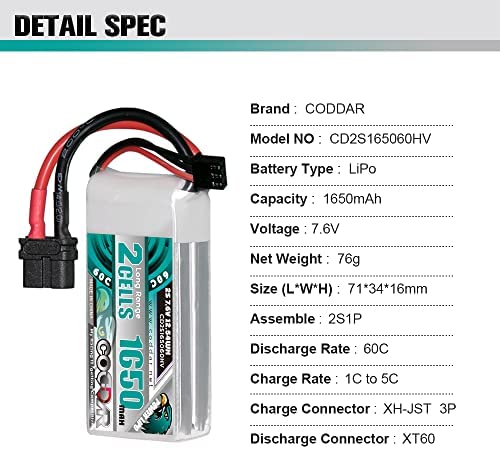 1650mAh 2S 7.6V 60C LiPo Battery with XT60 Connector for RC Racing Drone FPV Quads Quadcoper