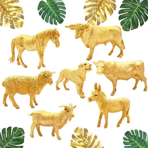 16PCS Metallic Gold Farm Animal Figurines and Palm Leaves Set, Plastic Golden Farm Animals Figures for Baby Shower Decor, Farm Themed Birthday Centerpiece, Party Cake Topper Decoration