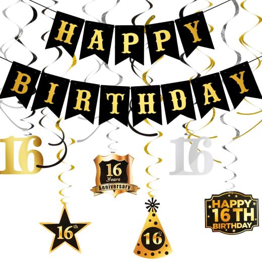 What you will get: 1Pcs Black Happy Birthday Banner,12Pcs Happy 16th Birthday Party Swirls Streamers,Perfect for 16th Birthday Party Decorations. B…