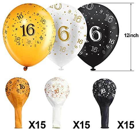 16th Latex Balloons Birthday Party Decorations Gold Black White Sweet 16 Balloons Party Supplies for Boys Girls Indoor Outdoor Anniversary Decor(45 Pieces 12 Inch) (16th)