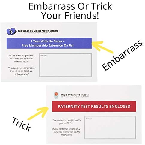 17 Unique Designs, Perfect For Sending Birthday & Holiday Cards – Send to your unsuspecting victims. Suitable for teens & adults, fun April fools day prank supplies Embarrass Friends & Family – The humiliating joke envelope will be seen by the mailman, spouse, office & housemates. Jokes range from embarrassing subscriptions to shocking invites from clinics etc Inappropriate Pranks By Mail – Shock your victim with a debt collection warning or final notice for jury duty. Top it off with prank stuff like fart spray, a glitter bomb or fake pull tabs & scratchcards inside if youre a true prankster High Quality – made from thick paper with good sticky seal. Large size 9.37 x 5.75 easily fits a standard 5×7 greeting card, perfect for Christmas cards or small presents like event tickets or a gift card Not For Children, Adult Pranks & Gags – These are practical jokes for adults & teens with a fun sense of humor. 17 wicked pranks and jokes for the prankster, each envelope prank gets hilarious reactions