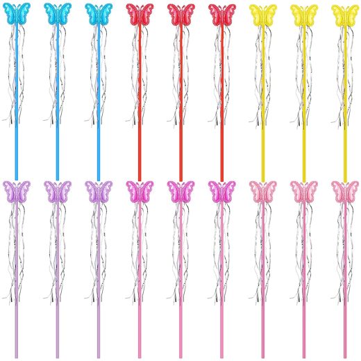 6 Kinds of different colors: butterfly fairy princess wand has 6 different colors in total, including red, blue, rose, pink, purple and yellow; The colors are holographic, which will present a very charming color under the sunlight, making your butterfly fairy princess wand more attractive What youll get: package comes with 18 pieces different colored butterfly fairy wand, in a total of 6 colors, 3 pieces of each color; Each butterfly fairy wand is 13 inches long, enough quantity to share as a gift to your friends; You can go to the princess party together, and you will become the most cute little princess at the party Nice for princess-themed parties: the fairy wand with ribbons in butterfly theme is classic for princess parties; With this butterfly theme fairy wand, you will be eye-catching on the princess party, costume party, carnival, princess theme birthday party and so on, readily make you look more lovely and attract peoples attention Cute costume prop: the colourful butterfly fairy princess wand is a great prop to be applied when attending a theme party or stage performance; The bright and shiny colors make your role-playing more realistic and fun, and bring you a funny memory Shiny fairy wands ribbons: the fairy stick has silver ribbons, which are very shiny; The glittering ribbons match the holographic butterfly well to be charming and ideal party decoration; It is very lovely to take photos with the butterfly fairy princess wand in hand, leaving unforgettable memory