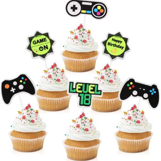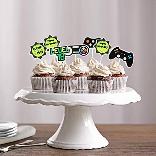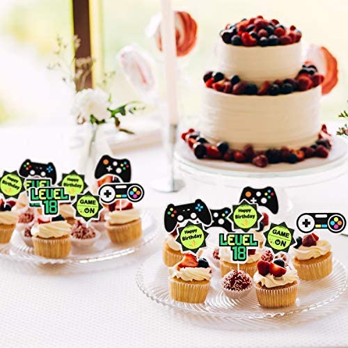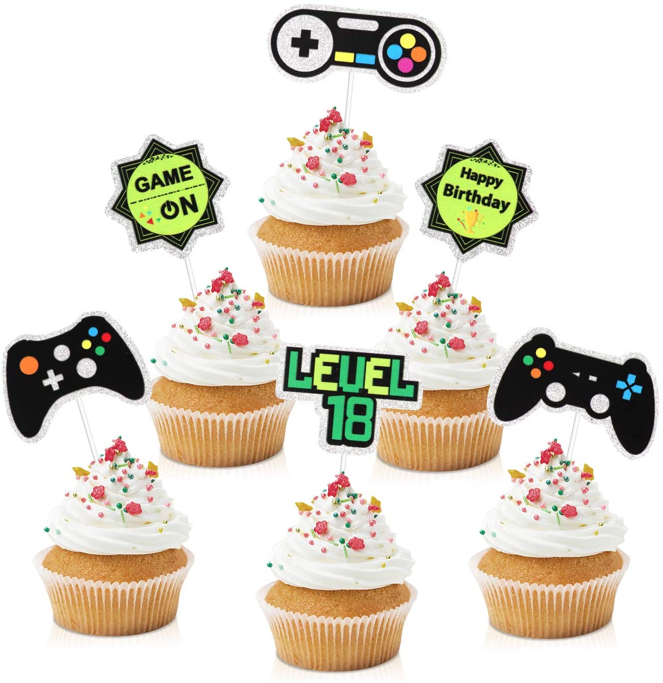 18pcs Video Game Cupcake Toppers – Gaming Level Up 18 Party Glitter Controller Cupcake Toppers Supplies – Boys 18th Birthday Game On Party Dessert Picks Decorations