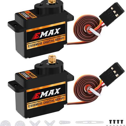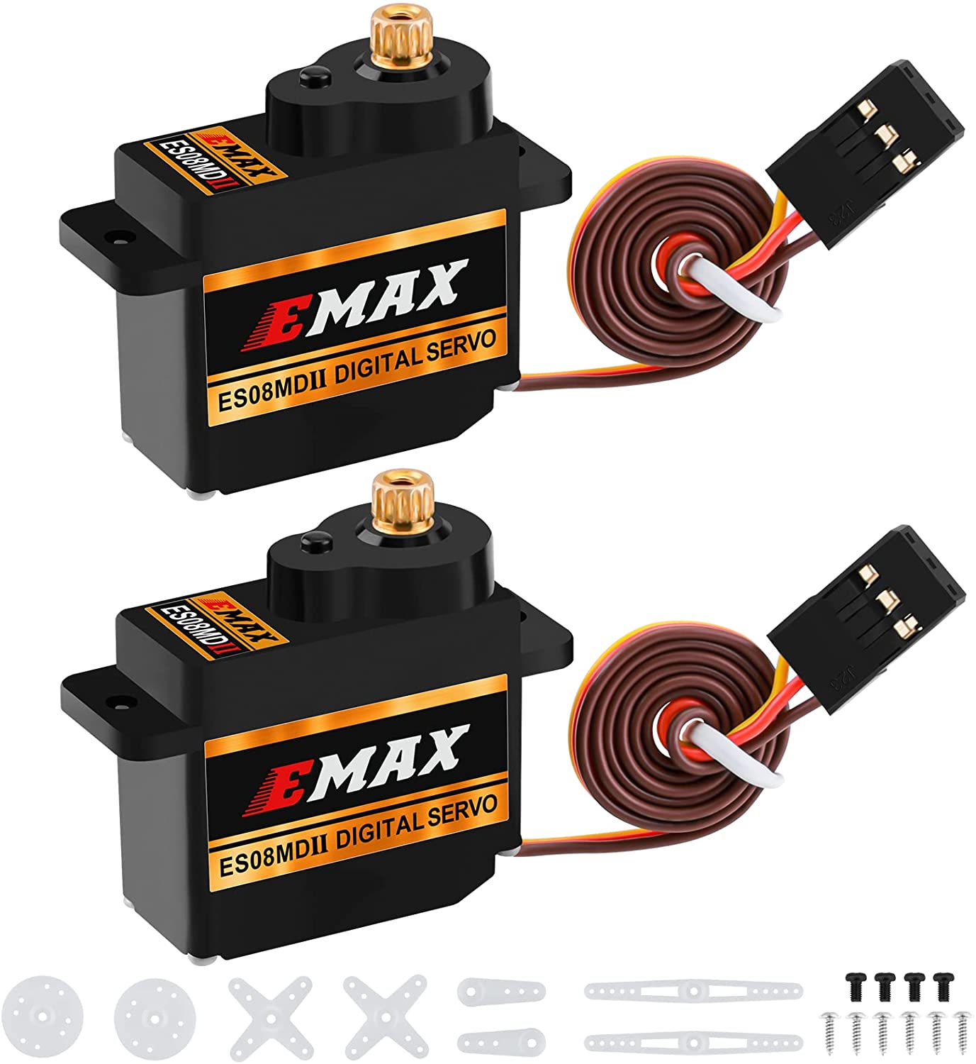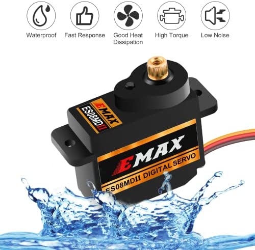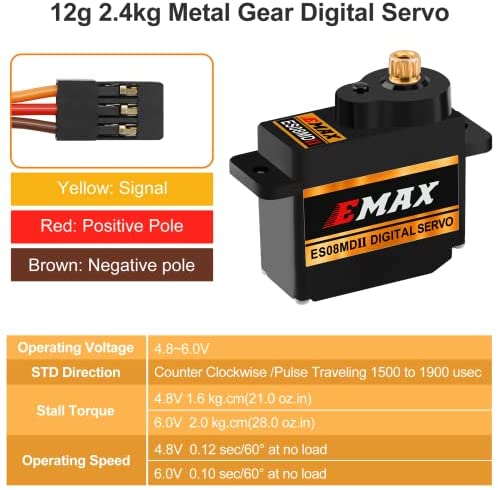 Specification: The EMAX ES08MD II digital servos torque: 1.6kg/cm(4.8V ), 2.0kg/cm(6V), positioning speed(at no load): 0.12s / 60 degrees(4.8V), 0.1s/60 degrees(6.0V), maximum rotating angle: 180°.It can instantly generate high torque to make your RC car overtake in curve