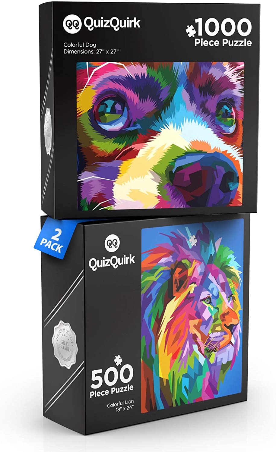 (2 Pack) QuizQuirk Puzzles, Colorful Lion 500 Piece/Colorful Dog 1000 Piece Jigsaw Puzzles for Adults/Teens (Puzzle Savers Included)