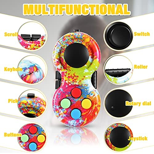 Humanized design: this fidget pad toy have a more humanized design and a more comfortable touch design; Joystick and 4 buttons, 2 of which are silent, 2 of which have crisp clicking sound, both of them will exercise your fingers flexibility while relieving stress Quality material: the durable fidget controller pad is made of quality silicone and plastic material; Rubberized frosting coat is designed for comfort grip while hand-held fidgeting; It has nice workmanship, so it is different from other common styles, giving you nice play feeling Multi-function: 4 clickable buttons(2 with sound and 2 silent), 1 game joystick, 1 finger massage roller, 2 gears, 1 spring loaded slider, 1 spin dial, 1 switch and 1 convex grip Thoughtful design: the fidget controller pad features bright buttons and a classic look that allows you to simulate the feeling of playing a game to entertain or reduce stress, which is a nice tool for you to kill time or have a nice leisure time Sweet gift: buttons of handheld fidget game pad can press crisply, diverting your attention from stressful work or study during the break, filling your time during waiting in a line or waiting for meeting your friends; It also can be applied as nice gifts for friends, family, classmates and adults, fitting for students, office workers, time-killers, and lovers of classic gaming