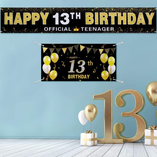 2 Pieces Large Happy 13th Birthday Banner 13th Background Banner Black and Gold Cheers to 13th Birthday Flag Birthday Photo Props Decor for 13th Bi…