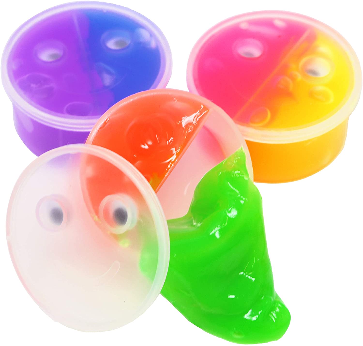 Amoeba putty, each pack includes 12 vibrant colored putty. Two tone putty comes in a neat plastic holder with a divider. Great feel to stretch, squeeze, shape, and play with this putty. These mini putty containers have two wiggly eyes attached to the lid. Perfect for party favors, prizes, or for school classroom reward box.