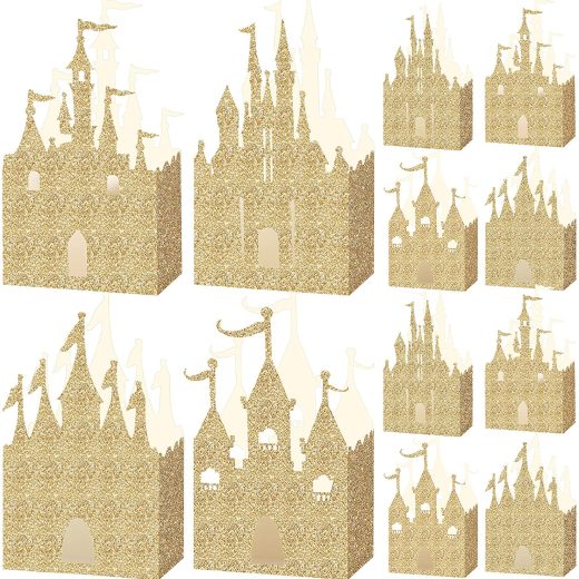 Shiny castle: the castle is an indispensable part of a princesss party; These glitter princess party box is the shape of the castle; The 4 different styles of the castle look very attractive; Its an ideal way to decorate your party and make it even more glamorous What youll get: package comes with 20 pieces castle-shaped candy boxes, a total of 4 different styles of castles, 5 pieces of each style; The castles are sparkling gold, looking very gorgeous, enough quantity to satisfy your decorative needs and nice for decorating princess-themed parties Quality material: the quality of the glitter party favor castle box is very good, and it is made of quality gold paper; With golden surface, the castle party favor box is very shiny; Putting such a glitter party favor boxes on the party table, it is not only beautiful but also very practical Ideal for tabletop decoration: the party favor box is designed in the shape of castle, which is attractive and in line with most peoples taste; Its great to decorate your party table with gold glitter party favor boxes, with realistic appearance, making your party look shiny and luxurious Wide range of use: gold glitter party favor box is suitable for princess birthday, baby shower, magic themed party and so on; Filling with party favors or small gifts like candies, nuts, cookies, snacks, chocolates, small toys, jewelry and more, is a nice way to make a surprise for your guests and friends