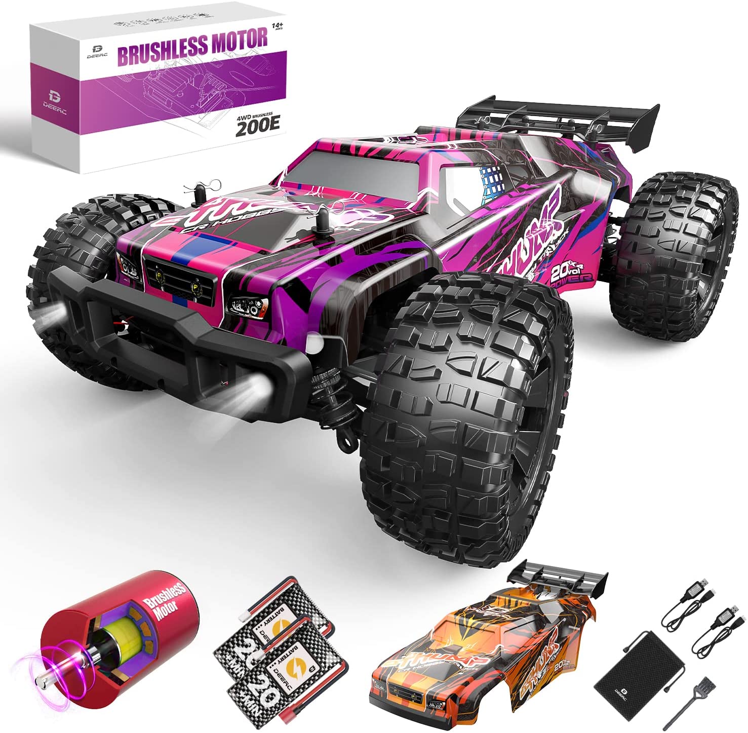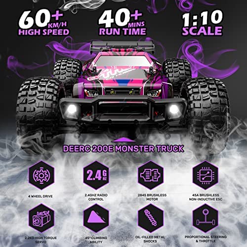 2021 Upgraded 1:10 Brushless High-Speed Remote Control Car: The newly designed 200E high-speed Remote Control Car in 2021 is equipped with a professional 45A brushless sensorless ESC and a 2845 brushless motor. With the help of dual heat sinks, its performance can be maximized, and output incredible motor power, perform 19240 revs per minute, which made a huge enhancement for the acceleration and allows the remote control car to have a top speed of awe-inspiring 60+KM/H. Nothing can stop DEERC!
