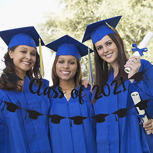 2021 Graduation Banner, Class Of 2021 Banner and Graduation Cap Banner Decorations for High School,College,Nursing, Doctor Graduation Party Decoration Supplies (Black Glitter)