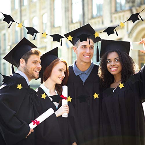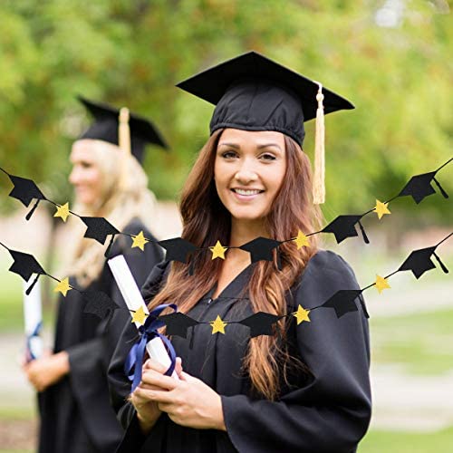 2021 Graduation Decorations: Perfect class of 2021 decorations for high school, college, nursing, doctor grad celebrations.Impressive decorations for your 2021 grad party, which will add a little sparkle to your graduation party decor and bring joy to you. Package Include: 2 pcs black gold glitter graduation cap banner, the perfect graduation theme party decorations for you, enhancing the joyful atmosphere for your graduation. Easy To Use: Its very simple and just place a ribbon through the hole at the top of each letter cardstock,a little DIY.You can use it as an excellent backdrop or photo prop to decorate your 2021 graduation party decor. Perfect Size: The graduation cap banners total length are about 19.6ft(2 ropes) and each graduation cap is 6 width x 4.7height.Made of eco-friendly cardstock and easy to use and can be hung at any location of your choice indoor or outdoor. Worth Buying It: This graduation cap banner will impress the grad celebration, adding brilliance to graduation party and record the important achievement moments.Make them astounded.Order it now!