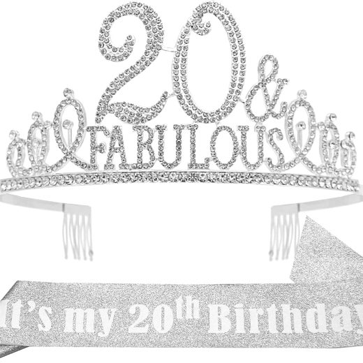 20th Birthday Gifts for Girls, 20th Birthday Tiara and Sash, 20th Birthday Decorations for Girl, 20th Birthday Crown and Sash for Girl, 20 Sash for Girl, u200b20 Tiaras and Crowns for Girls