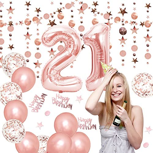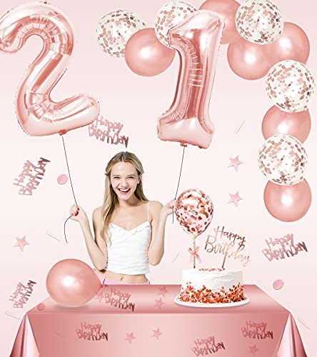 21st Rose Gold Birthday Party Decoration – Happy Birthday Banner, Glitter Circle Dot Garland Streamer, Cake topper, Foil Tablecloth, Rose Gold 21st Balloons, for Women Girl Birthday Party