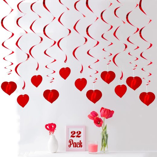 Streamer Red Hanging Heart Swirl Decorations great for Wedding Engagement / Nursery Decorations/ Birthday Party/ Graduation Party / Baby Shower/ Anniversary/ Anniversary party, Photo backdrop, Dance Recital and more. Specifications: Material: Double Sided Colors/Style: Red Heart Foil Swirls Size: Heart 3.7*3.5 inch, Foil Swirls 27 inch length Wide Usage: Decorate on walls, trees, windows, door, Photo backdrop, garden, patio, yard, parade, porch, hang from ceiling, from branches in trees outdoor. Package Included: 22 x Red Heart 22 x Foil Swirls 22 x Plastic hook 22 x Plastic Tag Fastener NOTICE: Choking hazard-keep away from babies and little children. Hanging Heart Swirls tangles easily-be careful when you’re unwrapping and unrolling the Swirls to prevent tangling.
