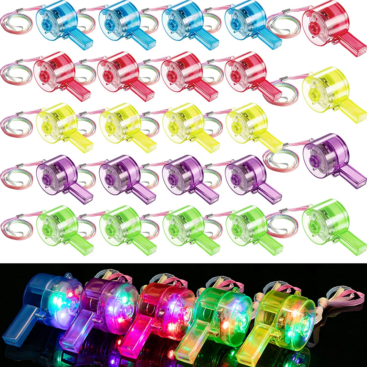 24 Pieces Glow Whistles Party Supplies LED Light up Whistle with Lanyard Necklace Colorful Glow in the Dark Fun Party Favor for Valentines Day Party Goody Bag Fillers Games Survival Emergency