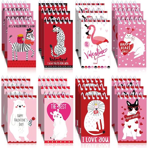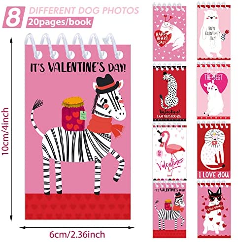 24 Pieces Valentines Day mini notepads animal and love heart spiral notebooks assortment Valentines Day party favors for kids school exchange gift goodie bag filler memo bulk, 8 style Features: Portable Valentines Day notebook set: Mini Valentines Day notepads are a sweet and useful gift for kids and friends, and also can be applied as exchange gift in the classroom or at school events. It is also a good choice for Valentines Day party gift bag filler, helping you easily create a loving party atmosphere. Specifications: Material: paper Page count: 20 pages Cover design: 8 styles Size: approximately 3.50 x 2.24 inches Package includes: 24 x Valentines Day mini notepads Notes: Manual measurement, please allow slight errors on size. The color may exist a slight difference due to different screen displays.