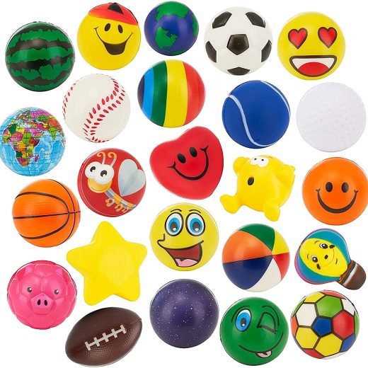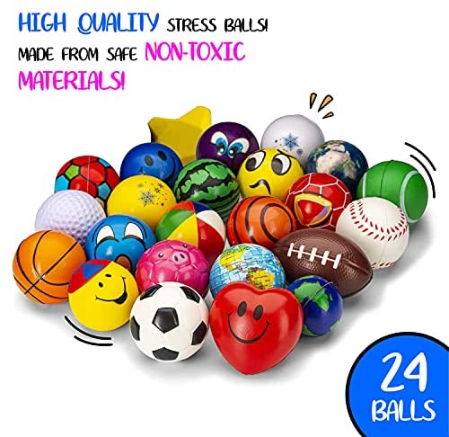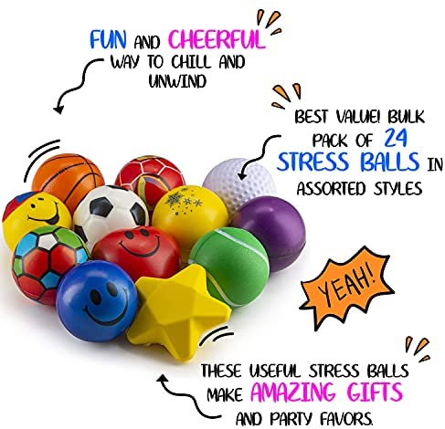 RELAX! Theres plenty of stress to go around you can let go of yours! Large selection of assorted styles, it wont take you long to find your fast favorite. Loved by both kids and adults; you are never too old to enjoy the benefits of a stress ball! EVERYONE LOVES A STRESS BALL! Its amazing what a little 2.5 ball can accomplish. Stress balls are proven to be therapeutic, calming and regulating. Often used in classroom settings, stressful office environments, therapists office, special ed classrooms, and in homes around the world. BULK PACK – BEST VALUE! Bulk pack of 24 stress balls in assorted styles; you can expect few duplicates. These useful stress balls make amazing gifts and party favors. After all who cant use a stress ball Plenty to go around – keep one in the car, at your desk, in your kitchen drawer and carry a spare in your purse. Just dont forget to share and spread the joy. TOP QUALITY STRESS BALLS! We know stress balls; and we chose the highest quality, safe and nontoxic materials for our latest collection. With just the right amount of squish these stress balls are highly durable and you can expect them to last a long while. HELPS TO SELF REGULATE! The benefit of squeezing is renowned, and has been proven to release energy that induces you to relax. They are a fun and cheerful way to chill, unwind, focus and stay in the moment. For Ages 3 years and up.