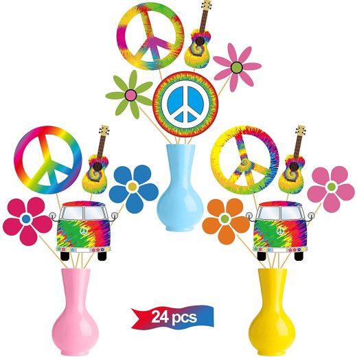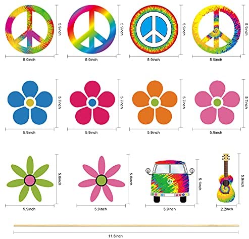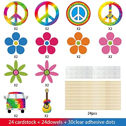 60s Party Decorations 60s Themed Centerpiece SticksMaterial: high-quality paper, wooden dowel Color: colorful Easy to install: In order to avoid falling during transportation, the kit is not assembled and needs to be assembled by yourself. All you need to do is to stick the cardboard on the bamboo stick with a sticker. Wide use: It can be inserted into decorative parties such as vases, cakes or fruit platter, or used as an excellent photography prop. Package includes: 24 x pattern cardboard, 24 x wooden dowels, 30 x stickers.