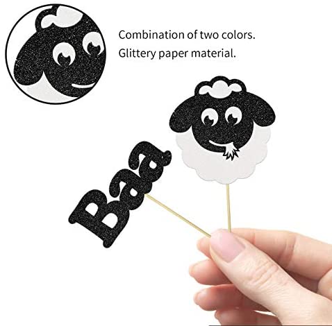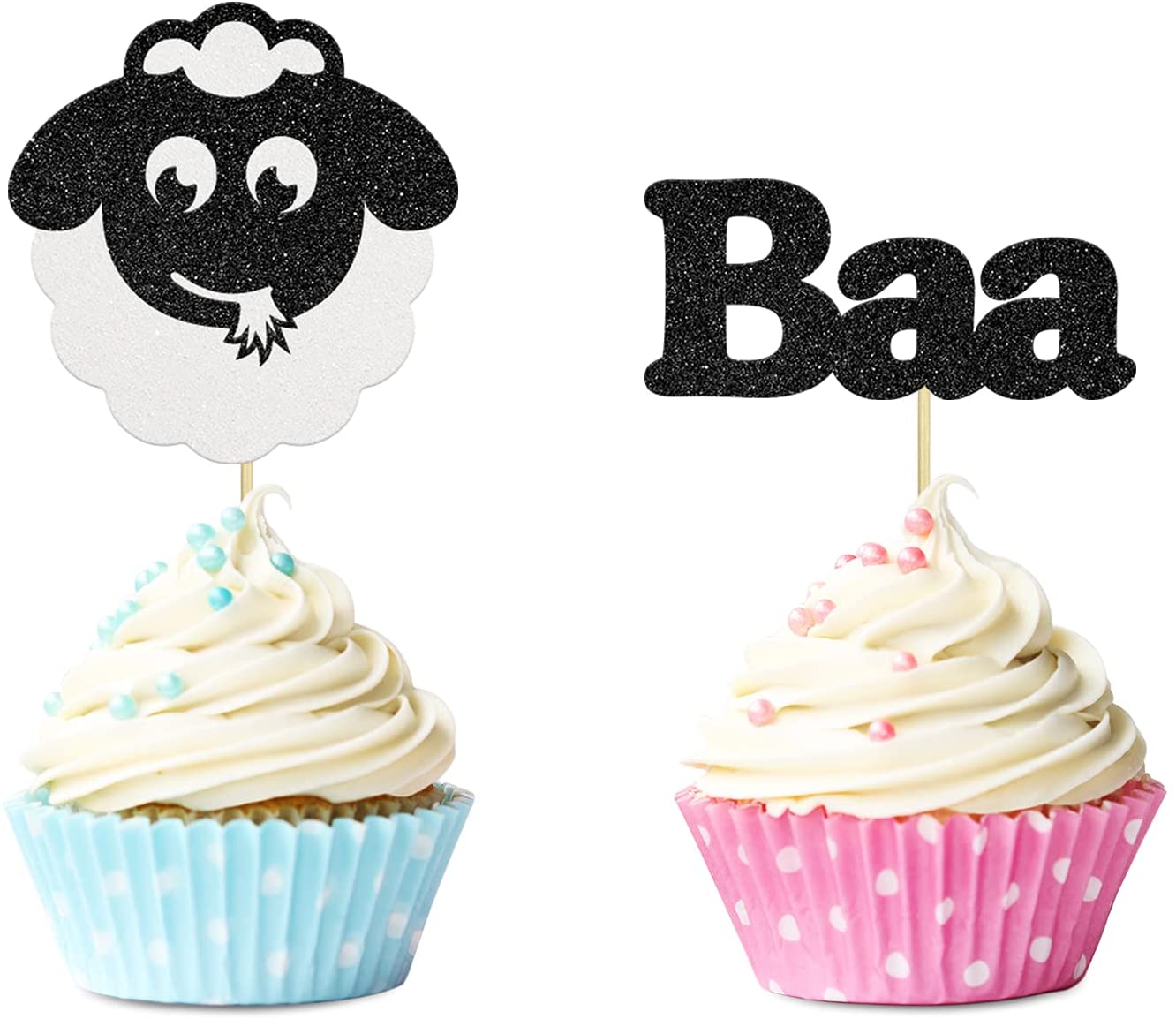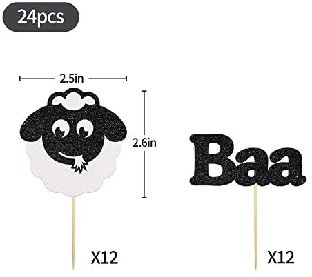 24PCS Black Glitter Sheep Baa Cupcake Toppers for Baby Shower, Happy Birthday Cake Decor, Animal Themed, Kids Birthday Party Decoration Supplies