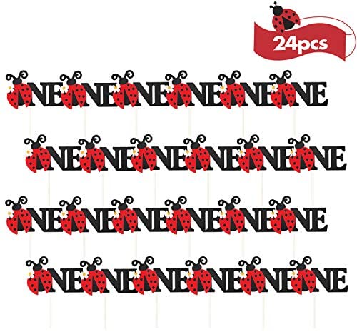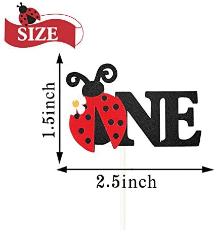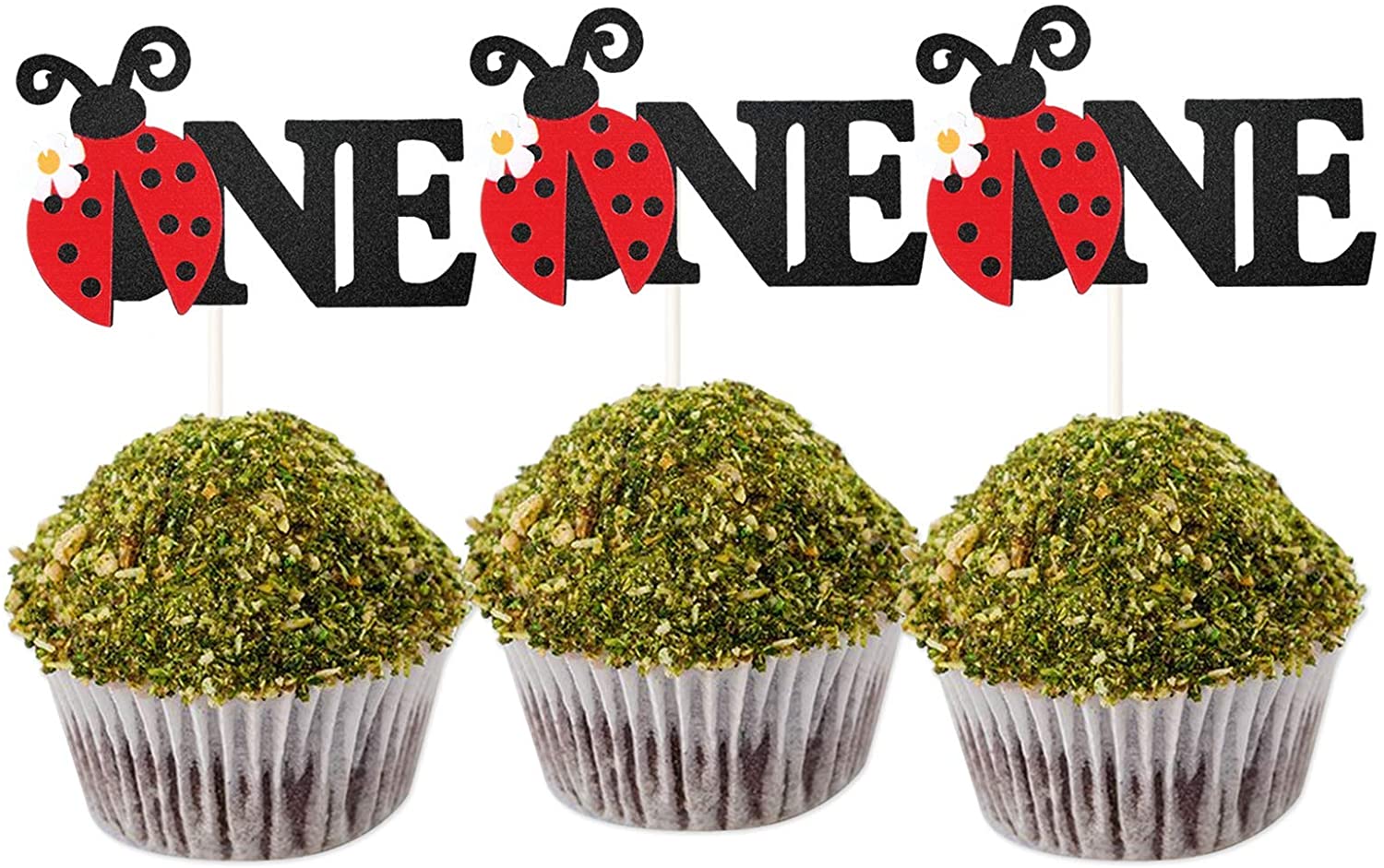 24Pcs Glitter Ladybug One Cupcake Toppers Garden Theme Party Dessert Cupcake Picks for 1st Birthday Wedding Party Baby Shower Spring Summer Garden Party Decoration Supplies