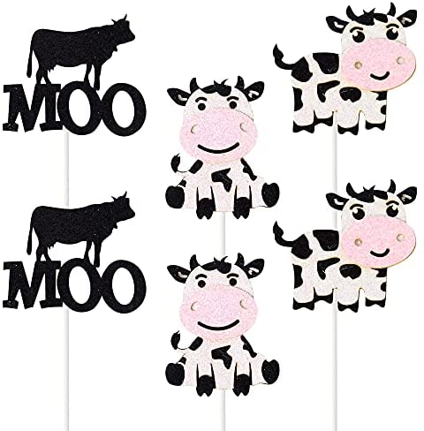 24pcs Milk Cow Party Happy Birthday Glitter Cupcake Toppers,Farm Animal Theme Party Decoration,Kids Birthday Baby Shower Favor Supplies