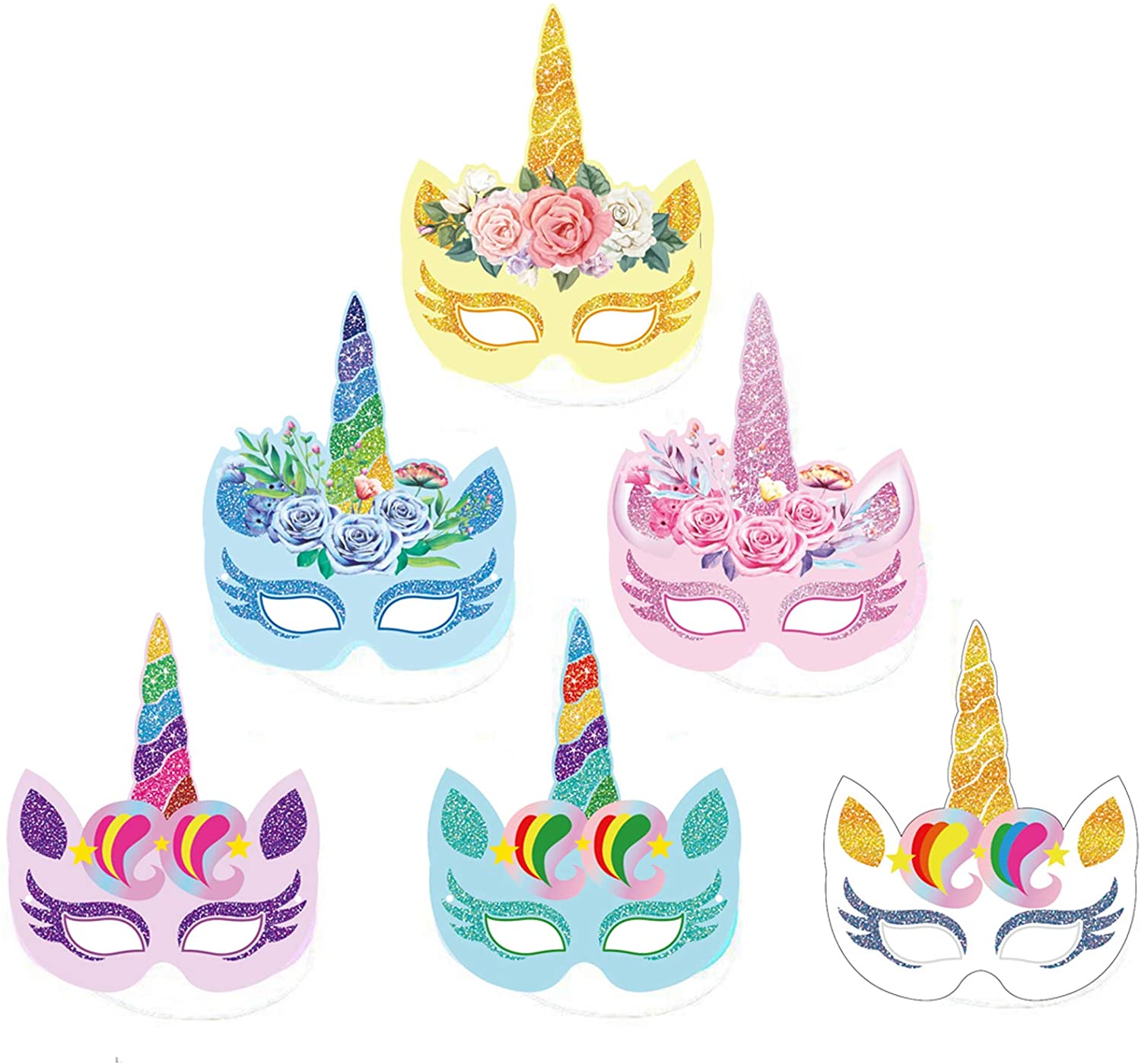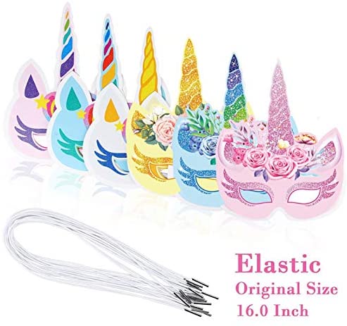 MAXHOPE Unicorn Party Supplies Set, 24 Pcs Unicorn Paper Masks, Kids Birthday Party Baby Shower Unicorn Themed Party Decorations About the Product MAXHOPE 24 Pcs Unicorn Party Supplies Set is design for Kids Birthday, Baby Shower, Wedding Party, Unicorn Themed Party, which can give the party perfect decoration and bring more joy to the party. Product Feature 100% New and High Quality The kids unicorn party masks have cute 6 different patterns, rainbow colorful color, boys and girls will love them Single-Sided Unicorn printing not only made the paper masks very beautiful, but also can let children to draw their own unicorn face The paper unicorn party masks are flat packaging when you get them, if it is damaged in transit, please send it back and we will give you a new product. Package Listing 24 * Unicorn Paper Masks 24 * Elastic Bands