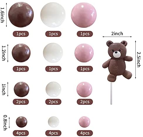 PACKAGE – Each package includes 25 pieces bear balls cake toppers, 1 piece clay bear cake topper, 8 pieces brown balls of various sizes, 8 pieces white balls of various sizes, 8 pieces pink balls of various sizes. SIZE – The size of bear cake topper is about 2 to 2.5 inches, the size of the brown white pink balls is about 0.8 inches, 1 inches, 1.2 inches and 1.6 inches. MATERIAL – The bear cake topper is made of clay, the material of the ball is plastic. WIDE USAGES – They are suitable for bear theme party, baby shower, bear theme party, birthday party, garden party. GIFTS – This is a wonderful gift for your children, friends and lovers.