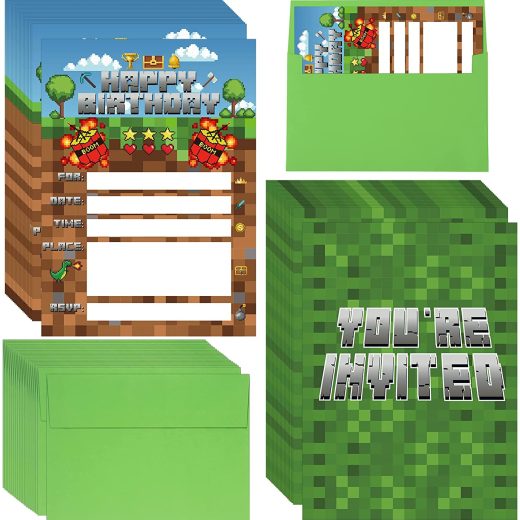 25 Pieces Pixel Video Birthday Party Supplies Game Themed Party Invitations Invite Card with Green Envelopes for Boy Kids Pixel Gamer Party Decorations Supplies