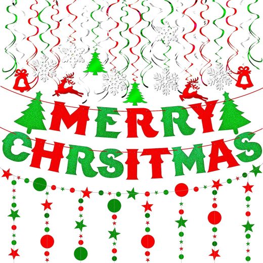 27 Pieces Christmas Glittery Banner Decorations Christmas Hanging Swirl Kit Glitter Green Red Circle Dots Stars Garland for Christmas Winter Xmas Holiday Decorations Party Supplies Wonderland Decor