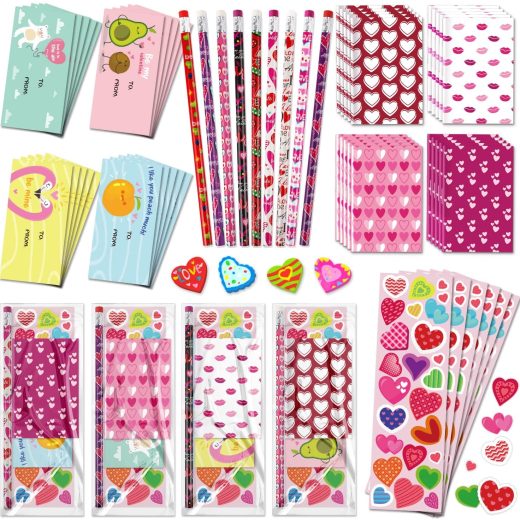 28 Pack Assorted Valentines Day Stationery Kids Gift Set, for Valentine Card Classroom Exchange Cards, Class Kidu2018s Pencil Eraser Notepad Sticker Bag, Pencils Bulk Pack Goodie Set, Toys Treats