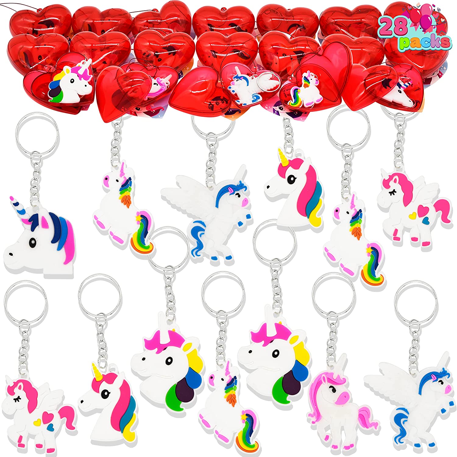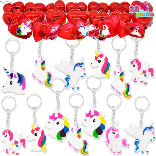 VALUE SET: Our Valentines classroom exchange party favors set includes 28 PVC unicorn keychains for kids. The unicorn keychains have 7 different cute designs. This valuable set also comes with 28 translucent red hearts case and 28 Valentine featuring 4 designs COOL DESIGN: The unicorn party favors are pre-filled into translucent plastic red heart shells, and come with heart shape valentine’s day cards for kids. Let everyone have a perfect valentine with our Valentine unicorn keychains. Theyll have your party guests laughing out loud IDEAL GIFT: This unique kids Valentine favors set brings excitement to the occasion. Perfect mini toys with greeting card to give to your kids who like something cute and extra special. It can also be a great exchange gift for class or small toys prize for classroom parties or other activities HIGH QUALITY: Our Valentine’s heart cases, toys, and Valentine cards are made from safe and high-quality material CUSTOMER SATISFACTION: Providing a 100% satisfaction experience is our main priority to our customers. Feel free to message us through “contact sellers” if products dont meet your expectations. The celebrations start at JOYIN!
