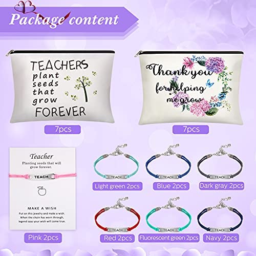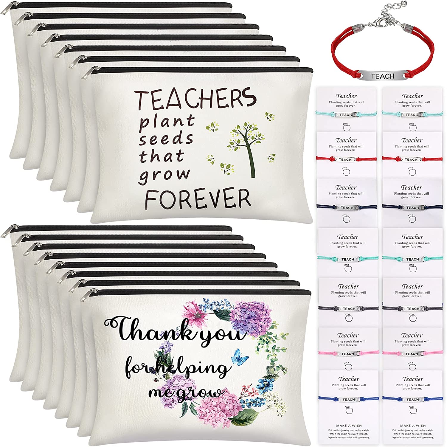 28 Pieces Teacher Appreciation Gifts survival kit bag Women 14 Funny Teacher Makeup Bags Toiletry Case in 2 Designs and 14 Teach Blessing Card Bracelets with Greeting Card for Christmas Teachers Day