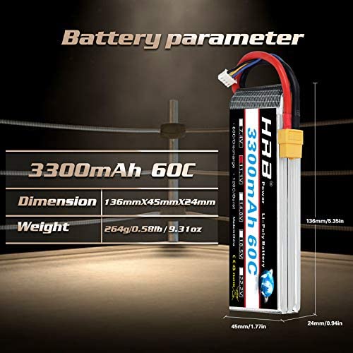 Specification: Material: Li-polymer; Battery voltage: 11.1V; Cell: 3S; Cell voltage: 3.6~4.2V; Capacity: 3300mAh; Discharge: 60C; Discharge plug: XT60 (Compatible with Tracxas Plug, Tamiya Plug, Deans Plug & EC3 Plug)