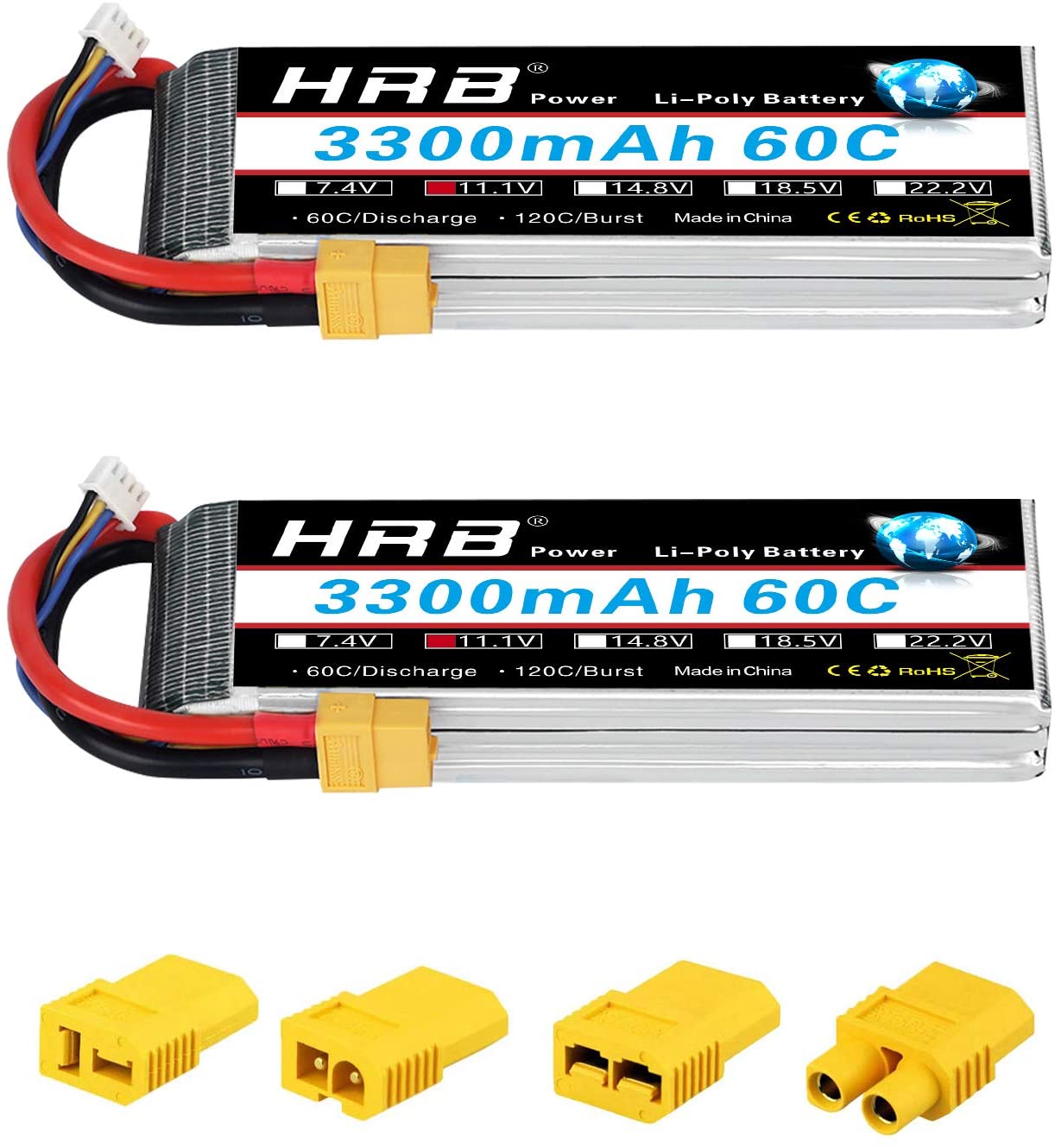 What you get: 2 Pack of HRB 11.1v 3300mah 60c 4s lipo battery with xt60 connector, 4pcs xt60 adpaters. Please contact us immediately if you have any problems with our product (enter into Your Orders for help or send email to our after-sales mailbox), we will reply you within 24 hours and solve it for you asap.