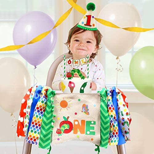 3-IN-1 CATERPILLAR BABY FIRST B-DAY PARTY DECORATIONS-Package includes 1 pcs highchair strip banner,1 set one cake topper, 1 pcs baby one hat. Perfect for a colorful caterpillar birthday party, spring insect theme first b-day photo booth prop, butterfly one cake smash, boys and girl highchair or nursery decor. PRE-ASSEMBLED BUTTERFLY ONE RUSTIC HIGHCHAIR BANNER-The length of the strips banner is approx 3FT. The fabric strips (green worm surge shaped, colorful dots patterns, bright blue, red wave point, tiny caterpillars patterns) were already strung on a string of twine to co-ordinate with the one banner, it is very easy for you to hang on the wall backdrop, party entrance, dessert table, kids high chair, etc THE HUNGRY INSECT FIRST BIRTHDAY CAKE TOPPER-The cake topper is approx 8 to 10 when it spread, printing fruits with holes,this tiny one banner were hung on top of the green striped straws, and you can stick the caterpillar on the cake to create a spring atmosphere. Fit multiple size smash cakes to celebrate your little boys or girls 1st birthday. SPRING GREEN ONE HAT-The diameter of the little one hat is approx 3.14, suitable for most babys head. Made of high-quality fabric, this caterpillars one hat is an exquisite handmade item, which will upgrade your babys dress up and get the best out of the celebration. WE CARE ABOUT YOUR SATISFACTION – If you have any questions about our products, please feel free to contact with us