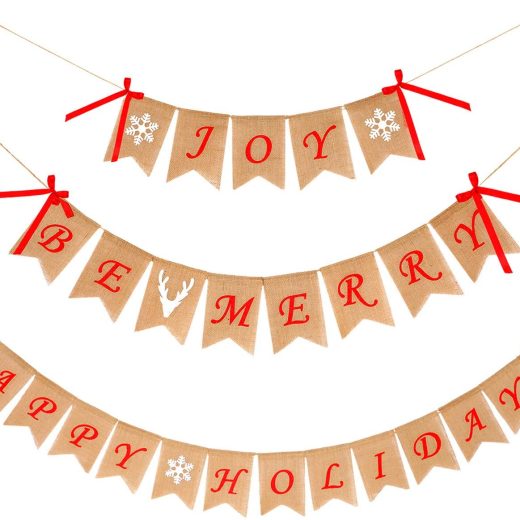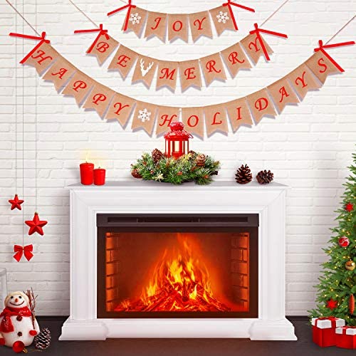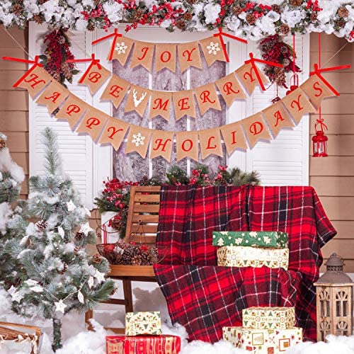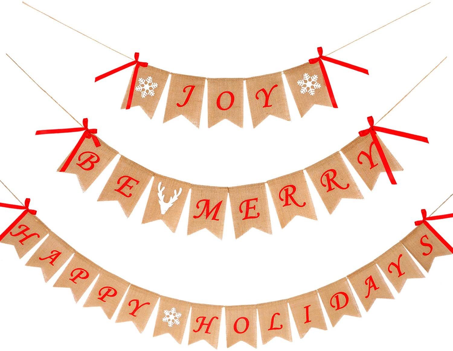 3 Pieces Burlap Christmas Banner Joy Banner Happy Holiday Banner Be Merry Banner Rustic Christmas Bunting Garland With Red Bow Ribbon for Christmas Fireplace Wall Tree Hanging Decorations