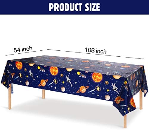 Plastic Package includes: 3 pieces outer space rectangular tablecloth table cover, designed with planets and stars on a dark blue background, ideal for decorating at classrooms or any outer space themed party Extra large size: space party tablecloth measures approx. 54 x 108 inches/ 137 x 274 cm, suitable for 8 feet long tables, which could accommodate for 8-10 people, large enough for kids boys solar system outer space theme birthday party supplies Durable material: made of quality thick plastic material, lightweight and portable, waterproof and durable, this space tablecloth is suitable for keeping your tables stain-free from spilled milk, juice, or soda, and prevent scratches from any objects like crayons, markers, glue and more Easy to use: these outer space table covers are suitable for both indoor and outdoor use, you can hang them up on doors or walls for use as decorative backdrops or put them across the room as banners, easy to clean up after parties; Or just toss them away or simply wipe down and store for next time Wide application: the outer space party table cover features with planets and stars on a dark blue background, which is an delicate decoration to create memorable outer space birthday party atmosphere, ideal for kids solar system outer space theme birthday party or other theme birthday party decorations and supplies
