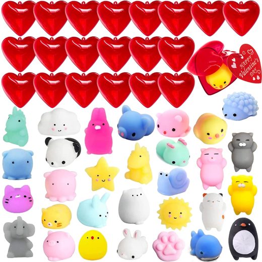 VALENTINES DAY FAVORS HEART BOX TOY SET: Valuable Valentine party favors set includes 30 pcs cute mochi squishies, 30 pcs red heart plastic cases, and 30 pcs valentine cards with ropes. Enough quantity meet your different needs. A fun way to encourage social skill development and a chance to express gratitude to family, friends, and classmates. 30 CUTE MOCHI ANIMALS: Each mochi squishy toy is cute and uniquely designed with different styles, great touch feeling, includes pig, dinosaur, cat, rabbit, duck, panda, elephant, tiger, cloud, penguin, chicken, hedgehog, sun etc. These mochi animal relief toys can be easily clean by rinsing in water. HIGH QUALITY: Each red heart shaped filled box is made of plastic material, cards are made of coated paper. They are reliable and sturdy, are not easy to break or deform, the bright red color and shape will maintain for a long time. Can be applied to pack your own toys. VALENTINES EXCHANGE GIFT:Valentine exchange game set will be a thoughtful Valentines Day present for kids’ school classroom prizes, gift exchange or your friend. Party favor, theme party favors, school activities, class events, school classroom game prize, love notes, goody bag fillers, miniature novelty toys, birthday parties, daily game activities, campus games and more. EXPRESS SWEET LOVE TO OTHERS: Children can use these Valentines toys kawaii party favors to spread the love and joy or express their gratitude to their classmates friends. Kids can also get them from the teacher and parent. A memorable for kids on Valentine’s Day! Send them to anyone kids want.