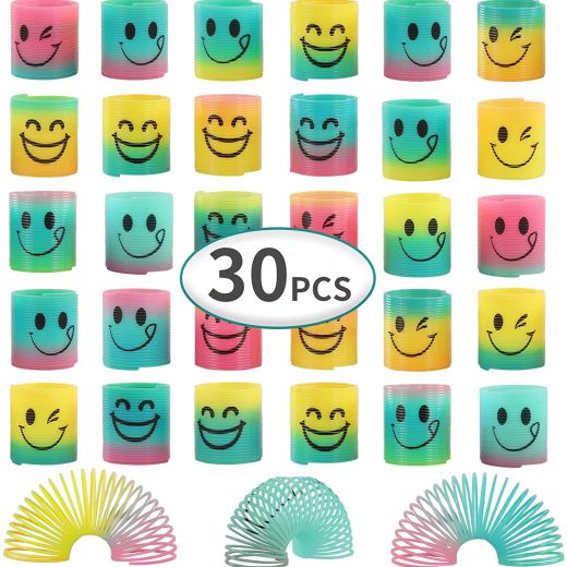 Value Pack:The Pack came with 30 pcs springs .It is printed on with different smiley them and has bright rainbow colors,bring extra fun. Easy to play:Fun to stretch out these colorful springs and watch them will snap right back. is can let you fell stress reliever . Everyone will have fun with this spring toy Educational Toys: develop kids imagination, color cognition, fine-motor skills.train baby fingers flexibility and body coordination Good Quality:It is make of the good quality plastic,and meet the US safe stander.it is stretch out the springs will still keep their shape no matter how you twist them. Best Gift:It is can fill them in kids party favor bags,birthday gift,Christmas stocking,Easter egg,Teacher Classroom Prize etc.Its a great childrens gift.
