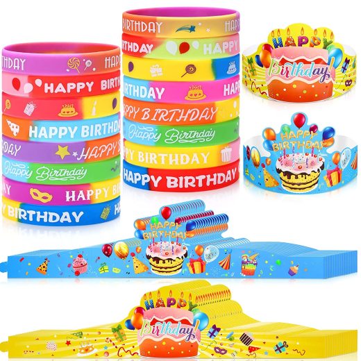 Features: Each paper happy birthday crown measures about 58 x 13 cm/ 22.8 x 5.2 inches, suitable for most people and can be adjusted flexibly to fit the size of your head circumference, besides the silicone birthday bracelets are about 2.36 inches in diameter, featuring nice elasticity and texture, soft and comfortable to wear. These school party supplies favors can be applied for birthday celebration in classroom, camp, home, office, daycare and church, and the birthday crowns for family birthday can help others know who was born on this day, the multi color wristbands can make other people feel involved too, increasing the happy atmosphere. Specifications: Material: Happy birthday bracelet: silicone Birthday crown: cardboard Color: as shown in the picture Size: Happy birthday bracelet: about 2.36 inches in diameter Birthday crown: about 58 x 13 cm/ 22.8 x 5.2 inches Package includes: 30 x Birthday crown 32 x Happy birthday bracelet Notes: Manual measurement, please allow slight errors on size. The color may exist a slight difference due to different screen displays. These products are only suitable for kids over 15 years old.