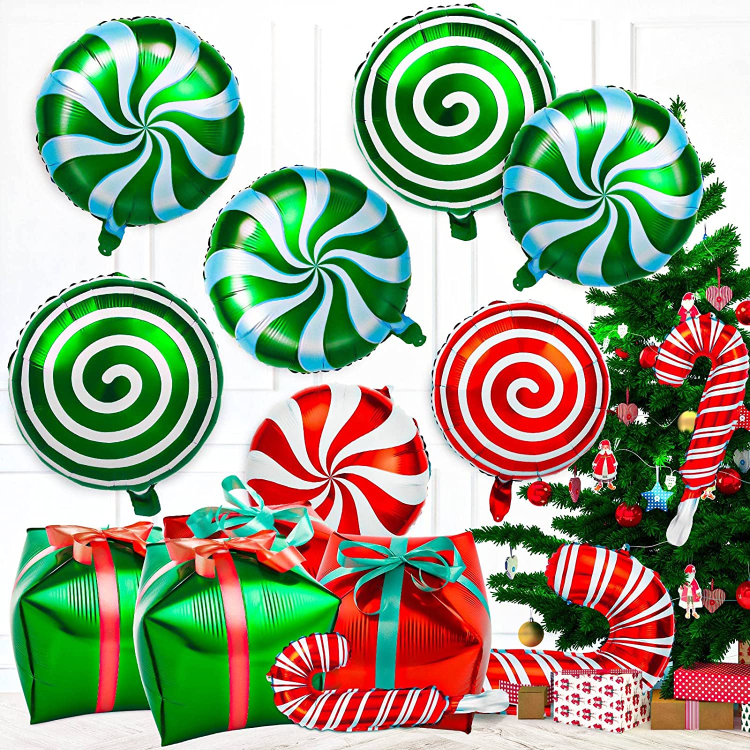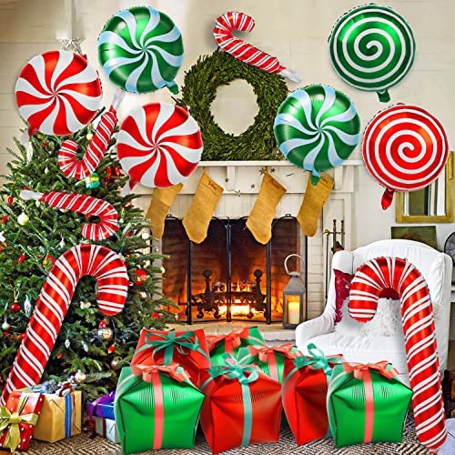 SWEET CHRISTMAS DECORATION: Our candy balloons kit adopt classic Christmas elements, such as gift box, cane, sweet candy. These foil balloons of vibrant red and green are perfectly fits the cute and sweet atmosphere of Christmas. QUALITY MATERIAL: These mylar balloons were made of high quality and sturdy Aluminum Foil Mylar material. With the lightweight and smooth surface, these balloons will look very full after inflate and not easy to leak even after 2 weeks. EASY TO USE: The globos de navidad designed with a self-sealing valve so its easy to tie or float. Each Christmas decor is designed with a small hole at the top of balloon,so that can be easily strung together and taped or hang them to wall. WIDELY APPLICATIONS:This large foil balloons kit is not only a great decoration or photo backdrop for Christmas, candy theme party, wedding, birthday party, but also can be used them for props in Willy Wonka play. They must be a huge hit on your party. PACKAGE & SIZE: You will receive 28 pcs balloons in 8 different styles, including 16 pcs of 2 styles candy balloons in two colors, 8 pcs canes in two sizes, 4 pcs gift boxes in two colors and 2 roll of ribbons with 5 meters long each.