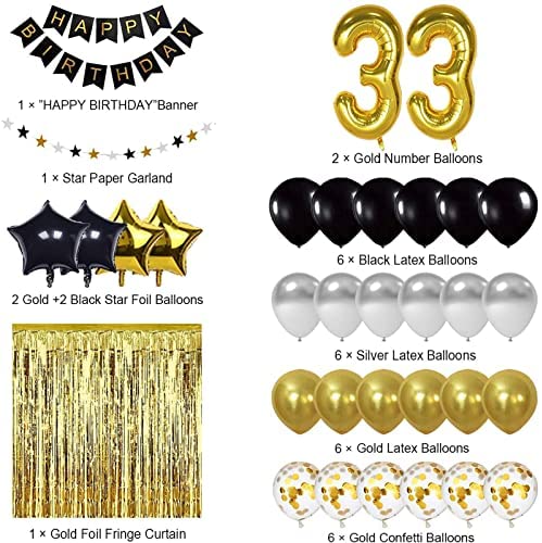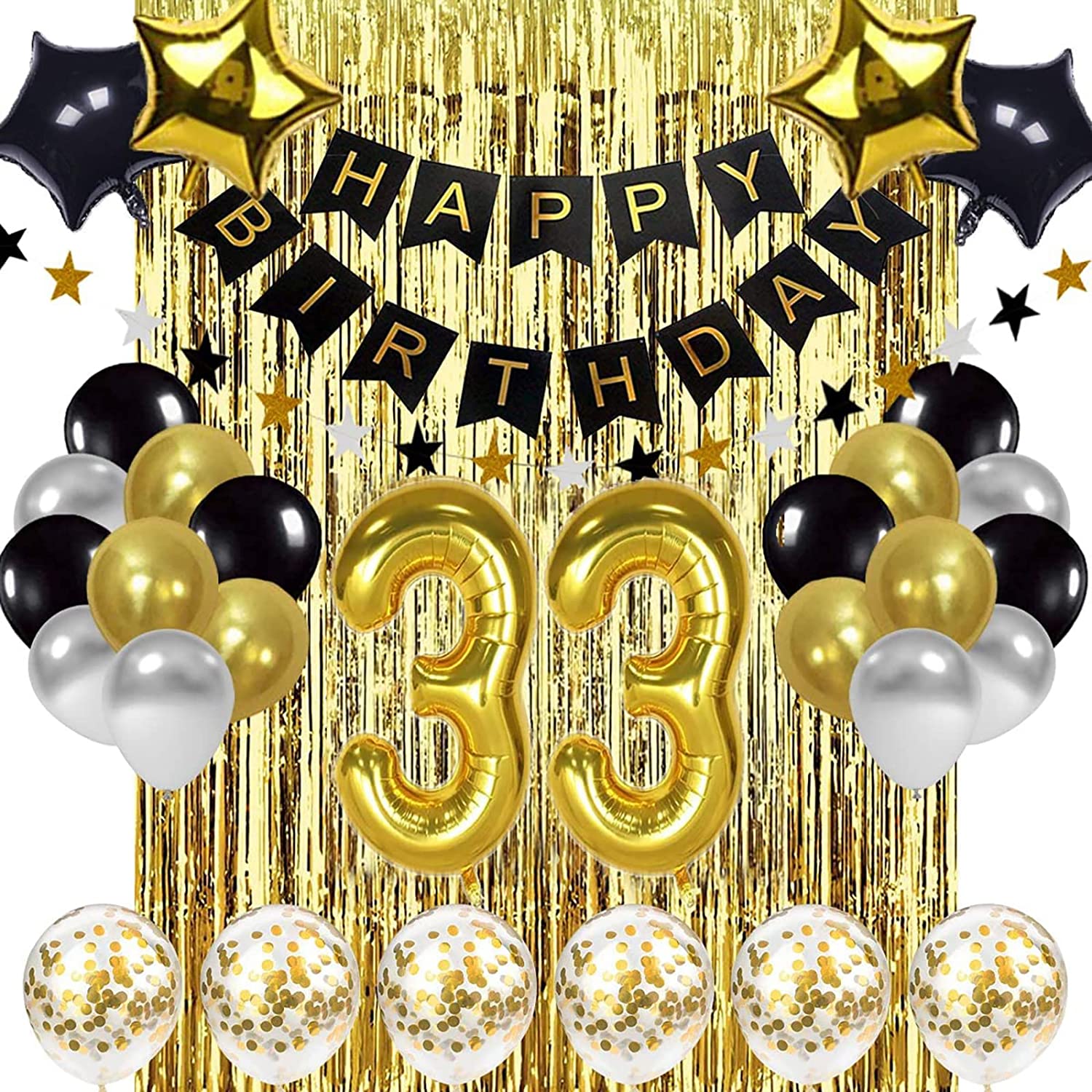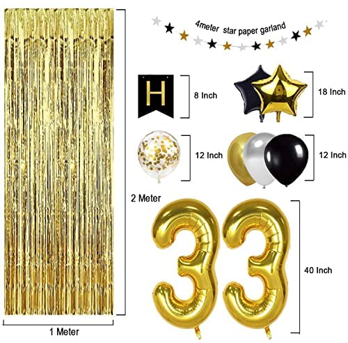 33th Birthday Decorations Black and Gold, Happy Birthday Banner, Number 33 Birthday Balloons, 33 Years Old Birthday Decoration Supplies