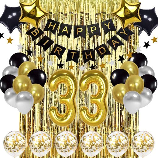 Be the first to review “33th Birthday Decorations Black and Gold, Happy Birthday Banner, Number 33 Birthday Balloons, 33 Years Old Birthday Decoration Supplies” Cancel reply