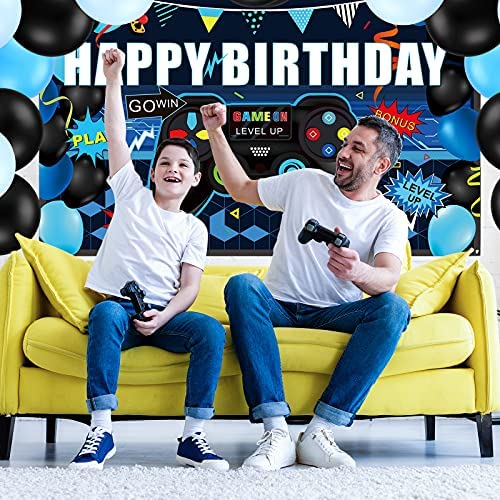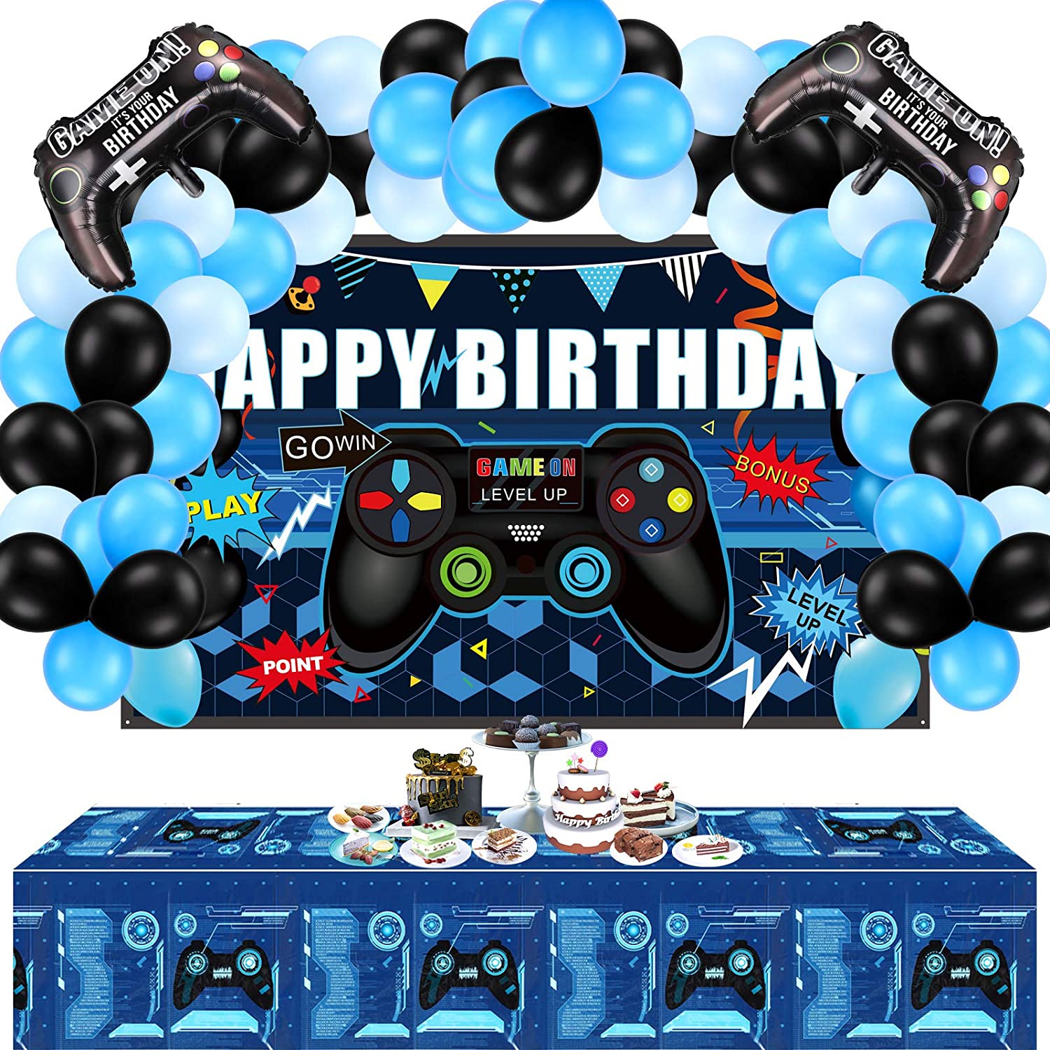 Package includes: you will receive 1 piece backdrop (5.9 x 3.7 ft), 30 pieces of latex balloons (dark blue, black, blue), 1 piece video game table cover, 2 pieces video game controller aluminum foil balloons, rich colors and diverse styles make the decoration more plentiful Widely applicable: this set is suitable for players who love games, suitable for game background wall decoration, boy birthday parties, party activity decoration so that more people can participate in the activity to enjoy the fun Sturdy material: made of polyester, the background can be hung and applied for many times, lightweight, non-toxic and can be folded to store after a party, wont take up much space; Most balloons are made of natural latex balloons, thick and strong, can support air and helium Correct spelling: the happy birthday gaming backdrop got a new, correct English spelling and rich color combinations, suitable for game background wall decoration, boy birthday parties, party activity decoration so that more people can participate in the activity to enjoy the fun Easy to use: both air and helium can be applied to inflating the balloon, and the operation is simple and convenient, you dont need to worry about them easily tearing, breaking or blowing up